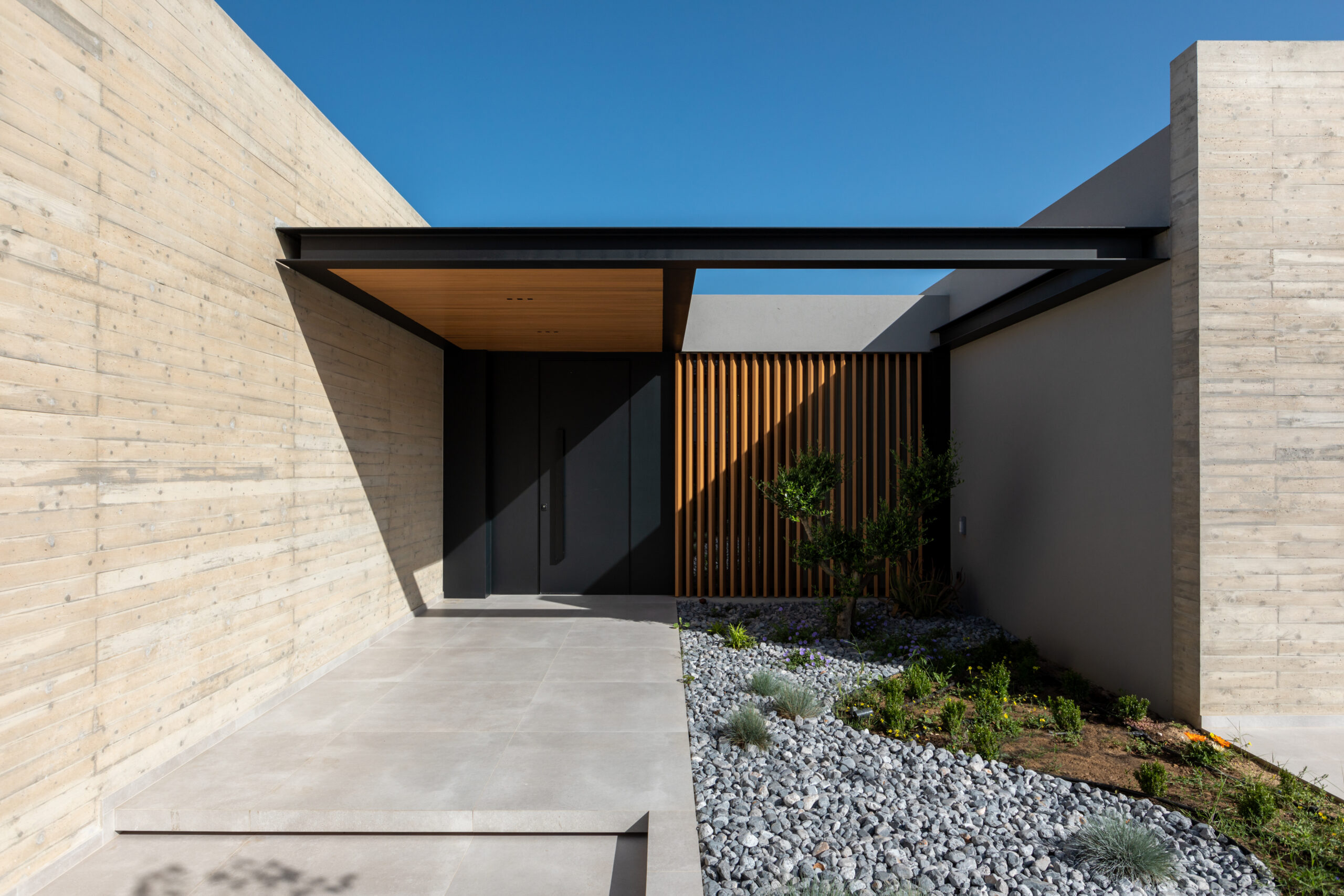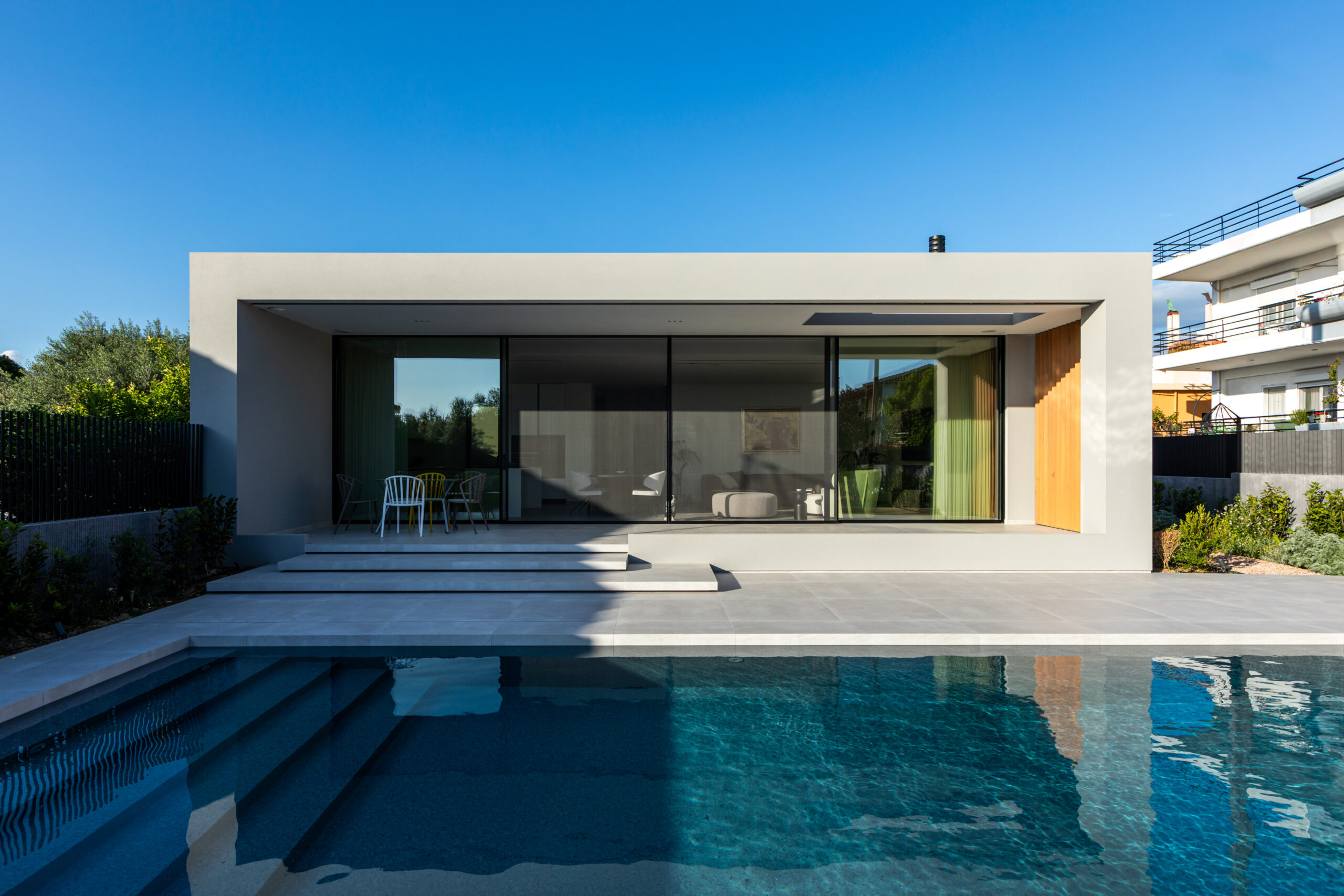 Ιδιαίτερη έμφαση δόθηκε στην κατοικία Α, όπου τα δύο βασικά τοιχία από ανεπίχριστο σκυρόδεμα εντείνουν την αίσθηση των κάθετων και οριζόντιων αξόνων. Το υλικό αυτό, σε αντίθεση με τη λευκή θερμοπρόσοψη του υπόλοιπου κελύφους, καθιστά τα τοιχία κυρίαρχα στοιχεία του συνθετικού λόγου, υπογραμμίζοντας την ένταση μεταξύ υλικού και νοηματικού διαχωρισμού.